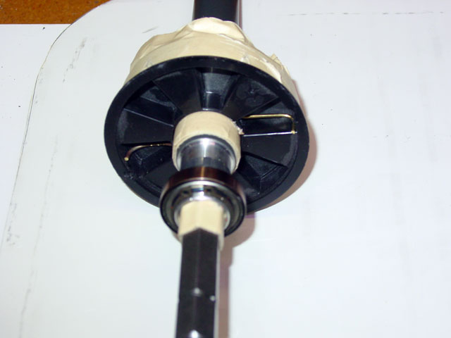 The hex rod came from the shredder, the bearings came from a dead fusing unit on a large laser printer at work. Liberal use of ribbon bushing (masking tape) made it all fit fine. I did have to drill and add a brass rod "cotter pin" through it to get enough torque.