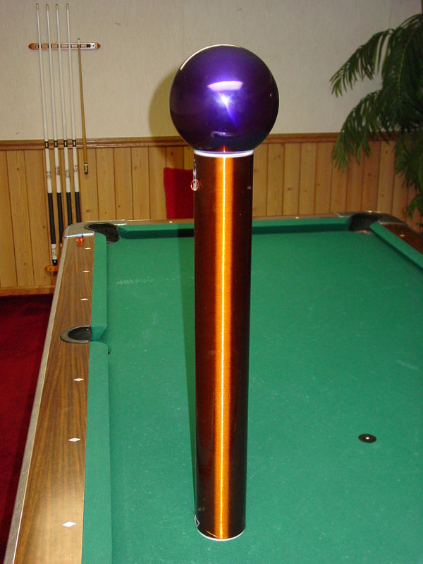 Here's my puny topload, a 6 inch "steel" gazing ball from Ebay. Maybe I'm stupid about steel, but I thought magnets were attracted to it. Or maybe this is a magic steel, the kind that can you only get from buying the cheapest thing on Ebay. I ran some NST arcs over it to see how the (alleged) "powder coat" would fare. Not very well... I see a wire wheel operation in my future.